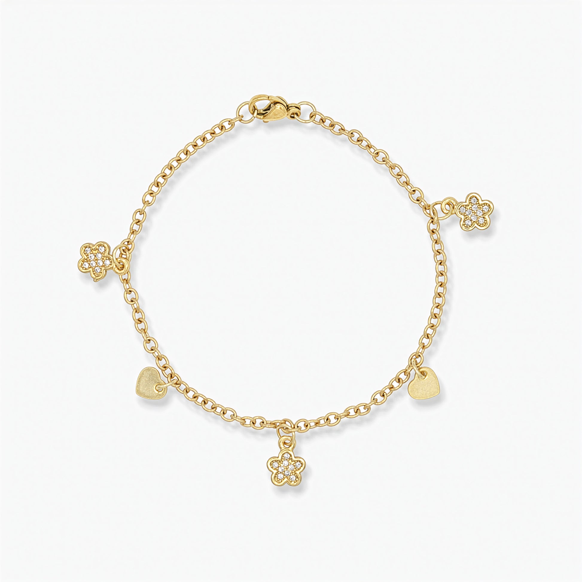 Women's Bracelet in 18K Gold Plated – Flower Charm with Zirconia and Hearts