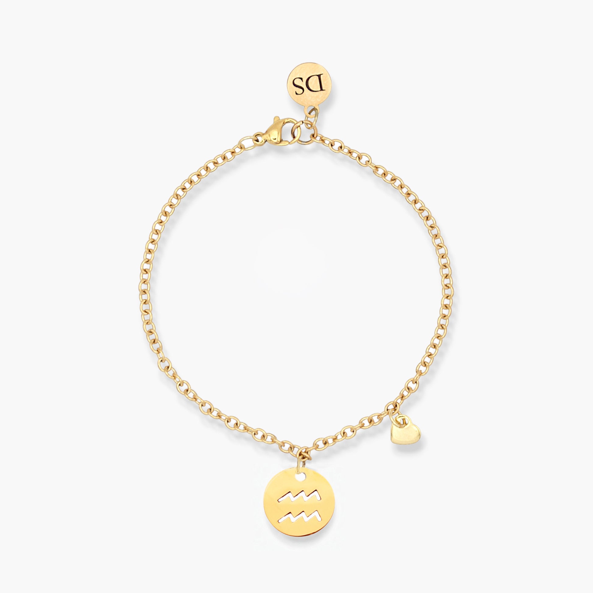 Women's 18K Gold Plated Bracelet with Aquarius Zodiac Sign and Heart Charm