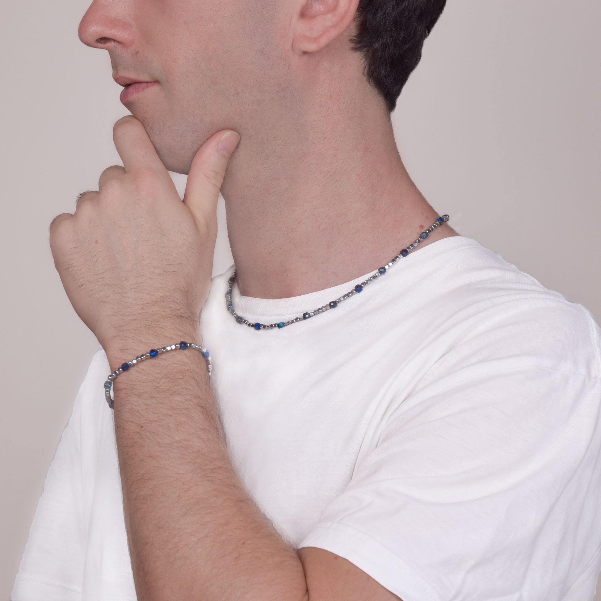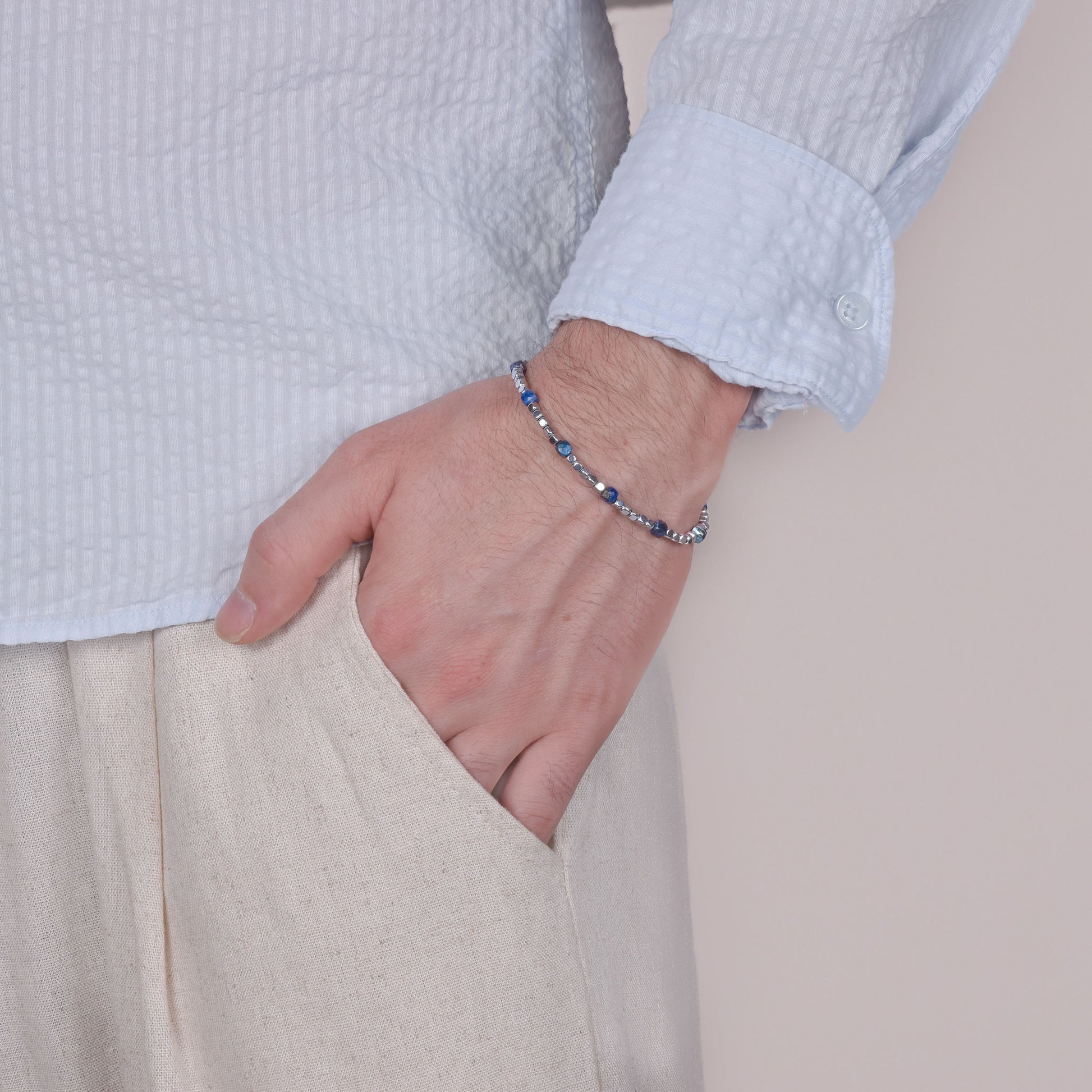 An accessory with a strong style, designed for the man who wants to convey balance, strength and awareness. This handcrafted bracelet combines the calming properties of sodalite with the stability of hematite, creating a perfect mix of elegance and meaning. Handcrafted with natural stones and stainless steel, it is adjustable to fit perfectly on the wrist.