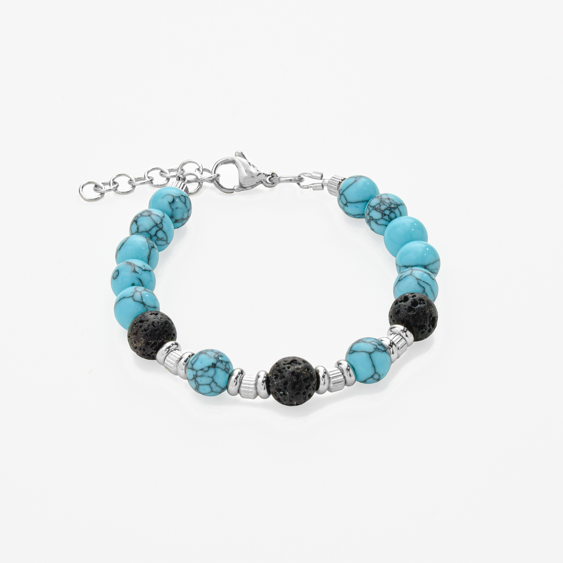 A powerful accessory, full of meaning and style. This bracelet combines the ancestral strength of lava stone with the protective energy of turquoise, creating a perfect balance between elegance and positive vibrations. Handcrafted with natural materials and stainless steel details, it is adjustable to ensure a comfortable and secure fit.