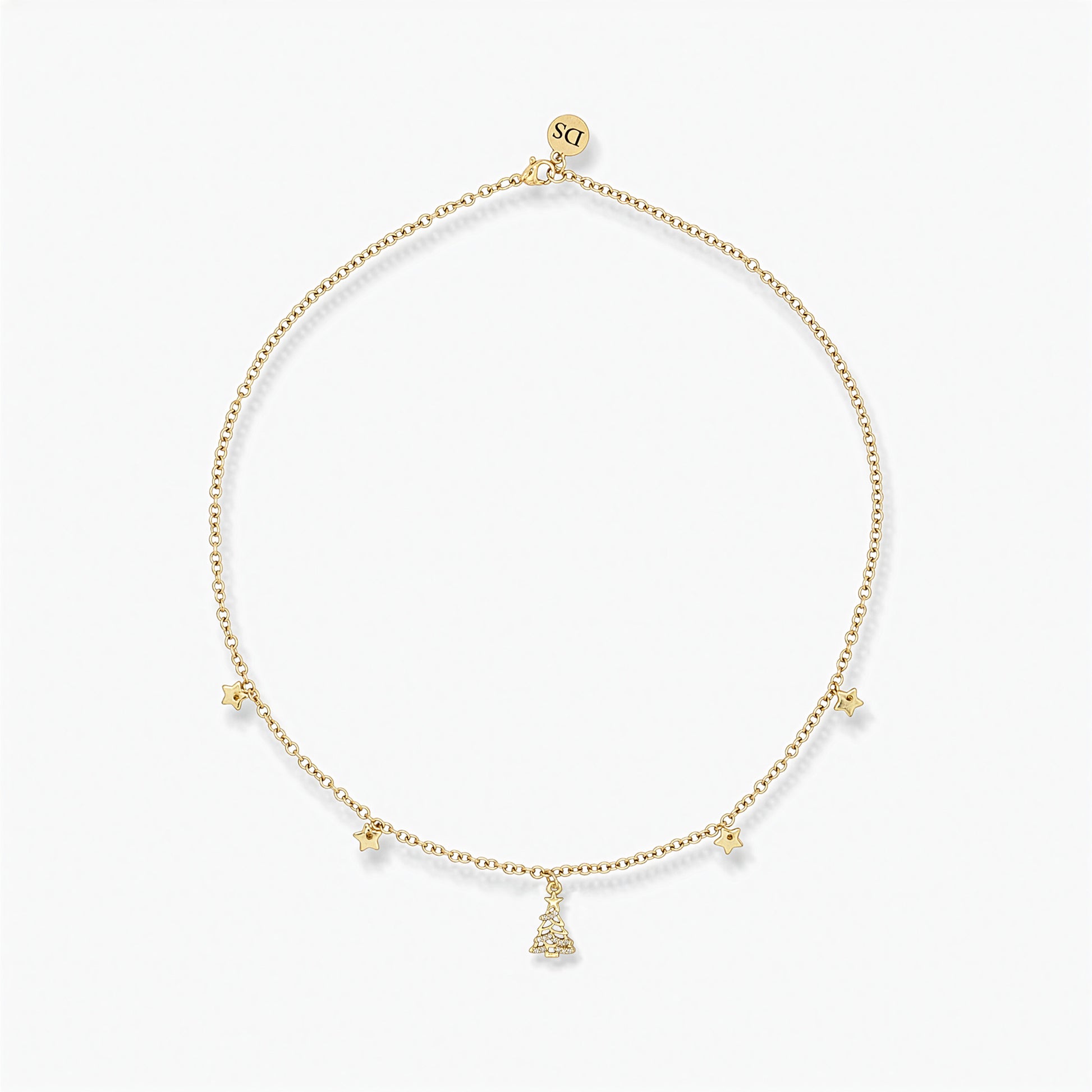 The DSCREAZIONI necklace with a Christmas tree and star charm in 18K gold plating is a celebration of the holiday season. The set zirconia stones reflect glimmers of elegance, making this piece a symbol of style and Christmas magic.