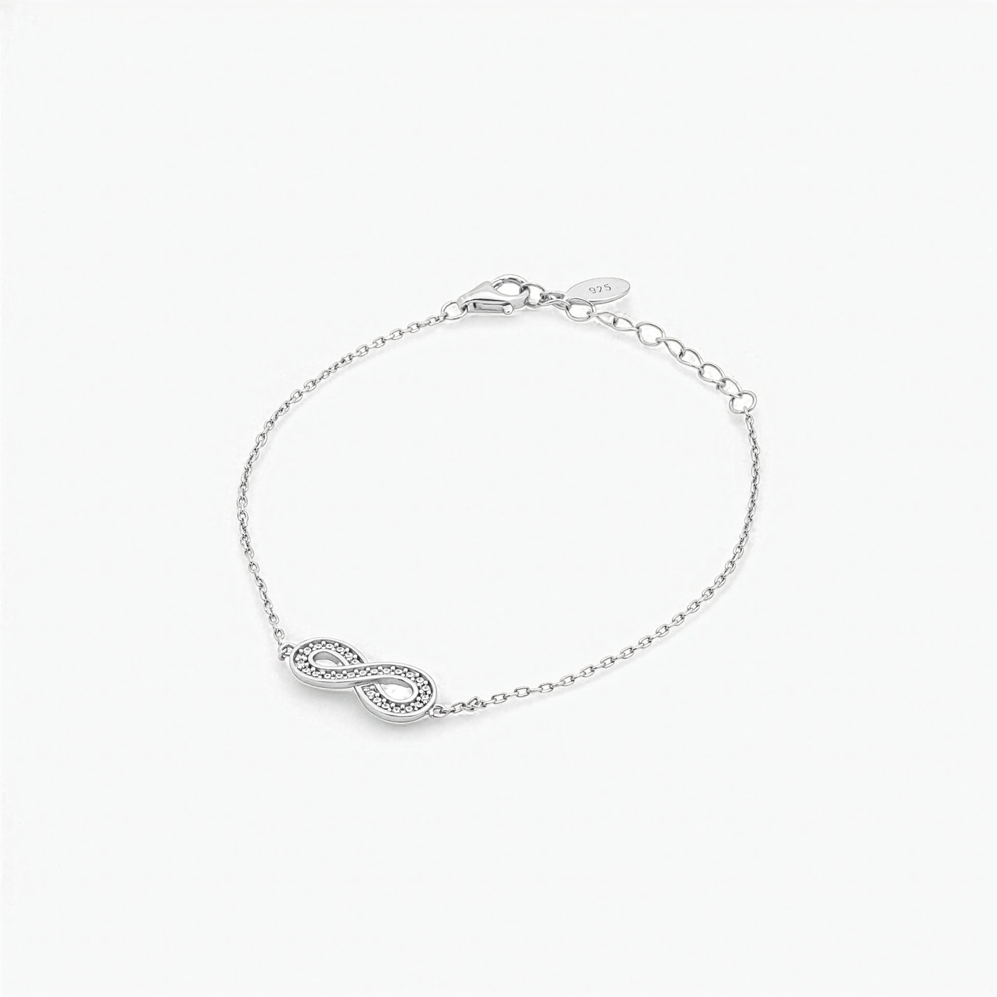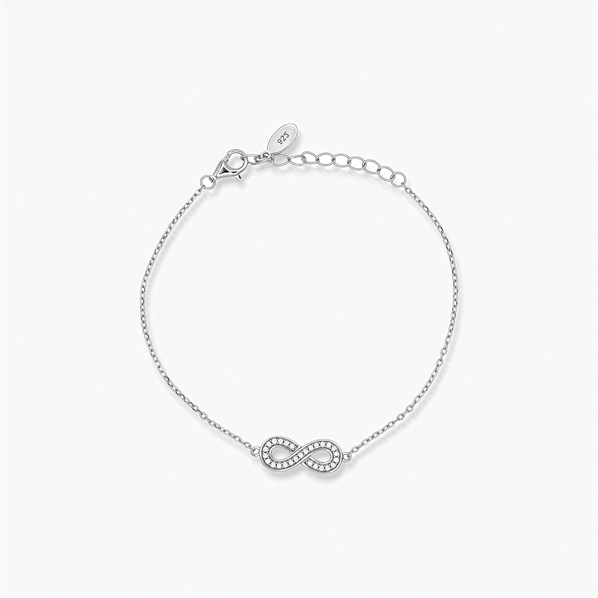 Bracciale da donna in argento sterling 925, impreziosito da un charm a forma di infinito con zirconi luminosi. Un gioiello sottile e raffinato che unisce stile contemporaneo e significato profondo, ideale per chi ama l’eleganza discreta e simbolica.