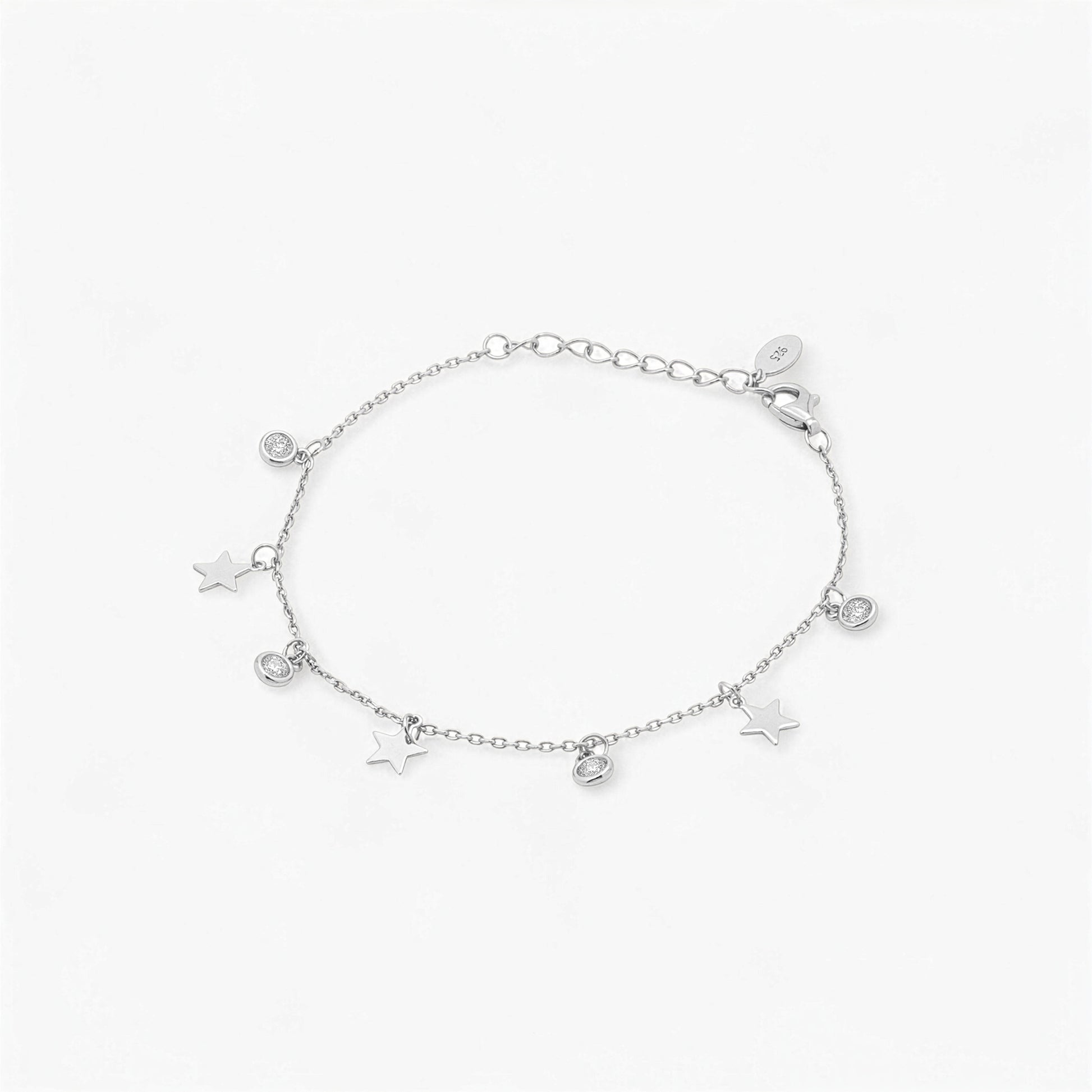 Bracciale da donna realizzato in argento sterling 925, arricchito da charms a forma di stelle e zirconi pendenti a goccia. Un gioiello delicato e luminoso, perfetto per aggiungere un tocco di luce e raffinatezza a ogni look.
