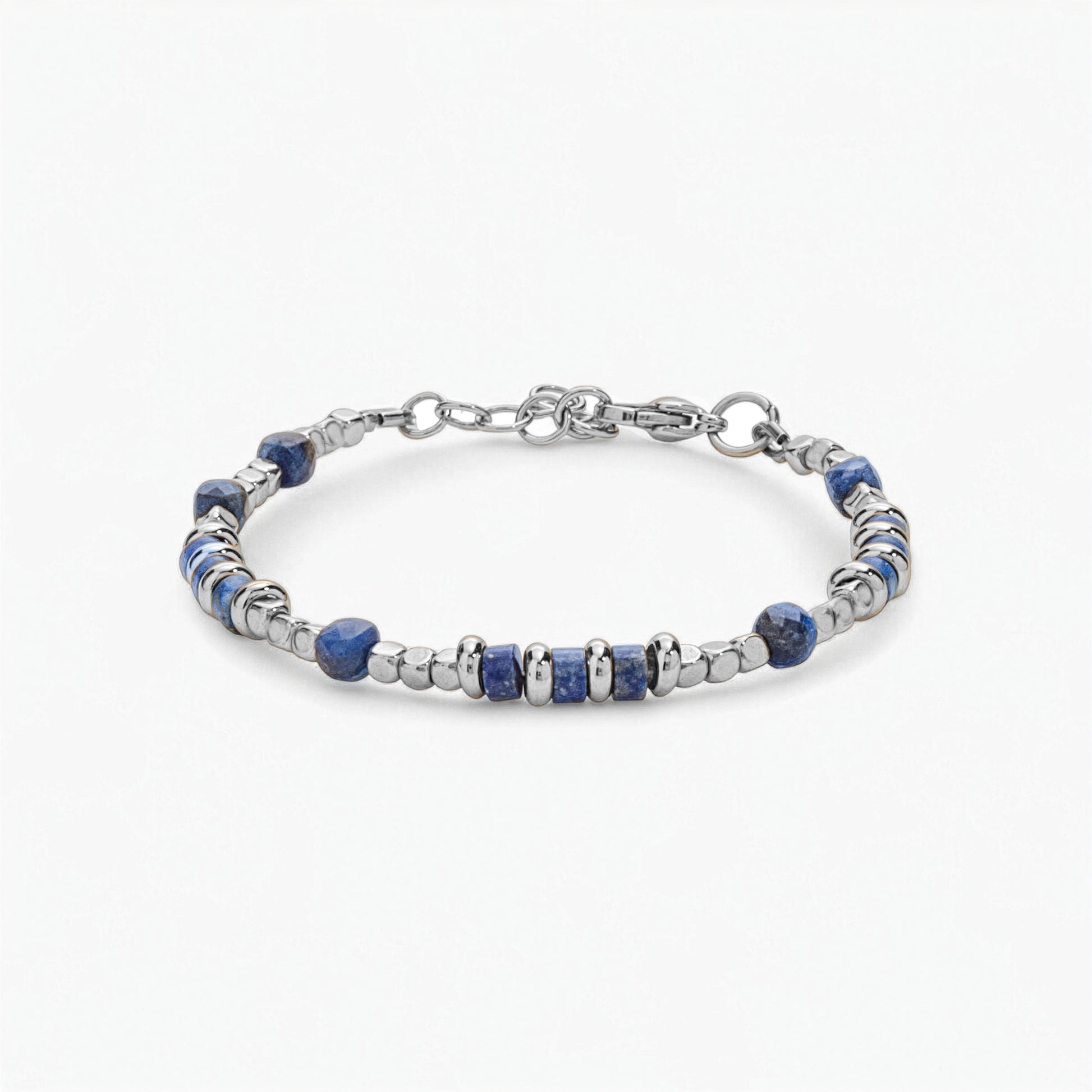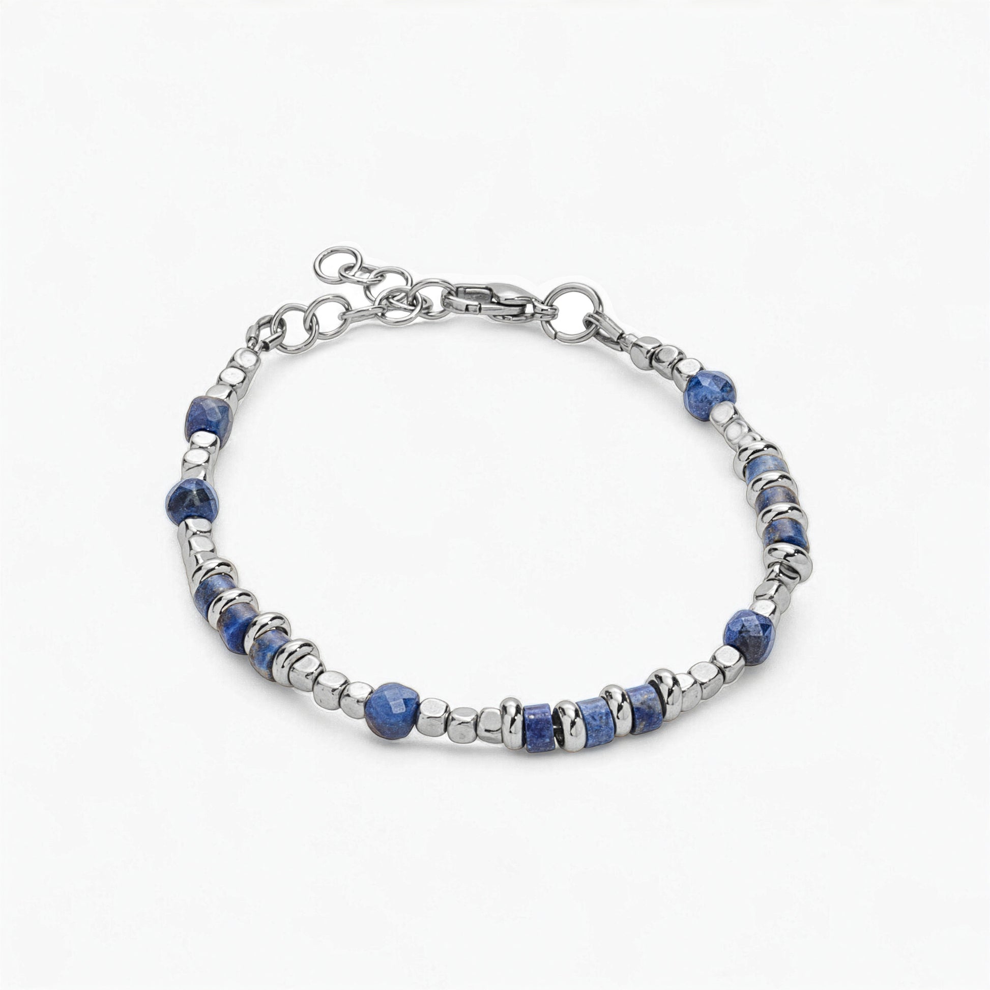 Bracciale uomo in acciaio inossidabile con pietre naturali di lapislazzuli, cianite ed ematite, chiusura regolabile con catena dal design minimal e raffinato, ideale per completare il look maschile con stile naturale e benefici energetici.
