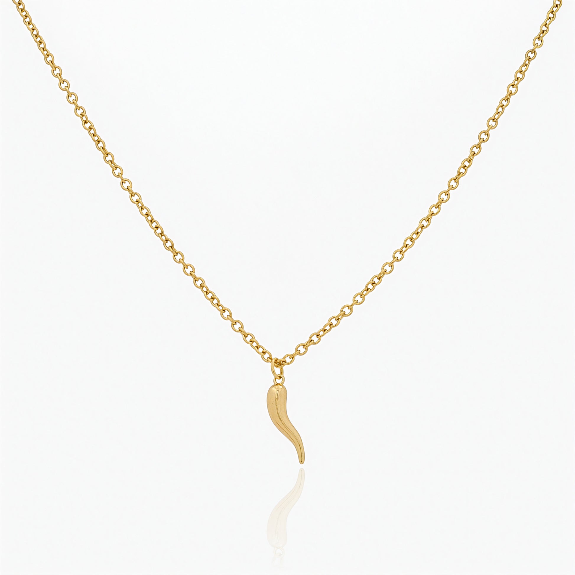 Collana da donna realizzata in acciaio inossidabile con placcatura in oro 18K, completa di pendente a forma di corno in oro 18K. La catena cobra sottile conferisce resistenza e comfort, mentre il pendente simbolico aggiunge un tocco di carattere e raffinatezza al look.