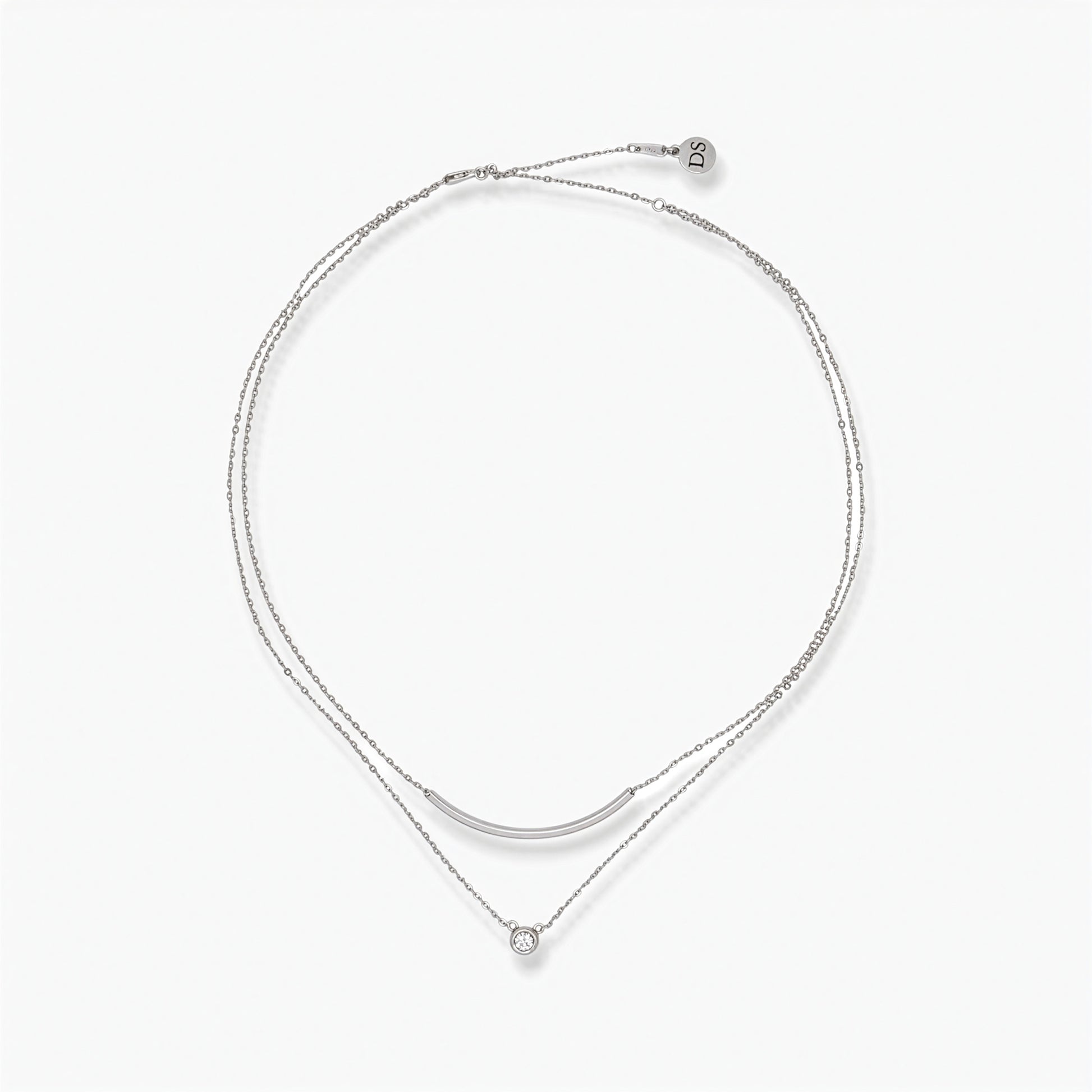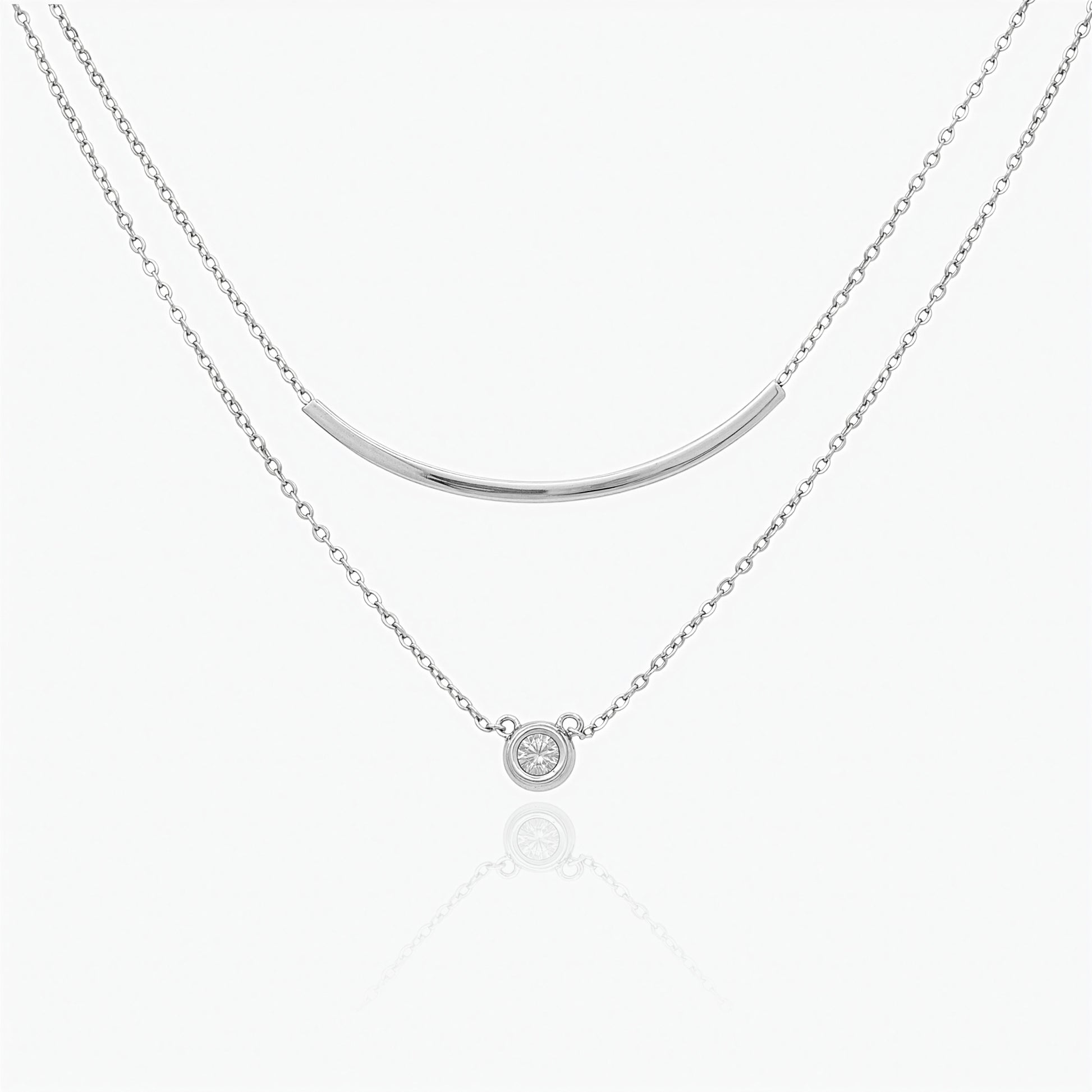Collana donna realizzata in argento sterling 925 rodiato, con maglia sottile in stile layered e pendente centrale in zircone AAA. Il dettaglio curvo dal design geometrico dona equilibrio e modernità, creando un gioiello raffinato e luminoso, perfetto per valorizzare ogni look con un tocco di stile contemporaneo.