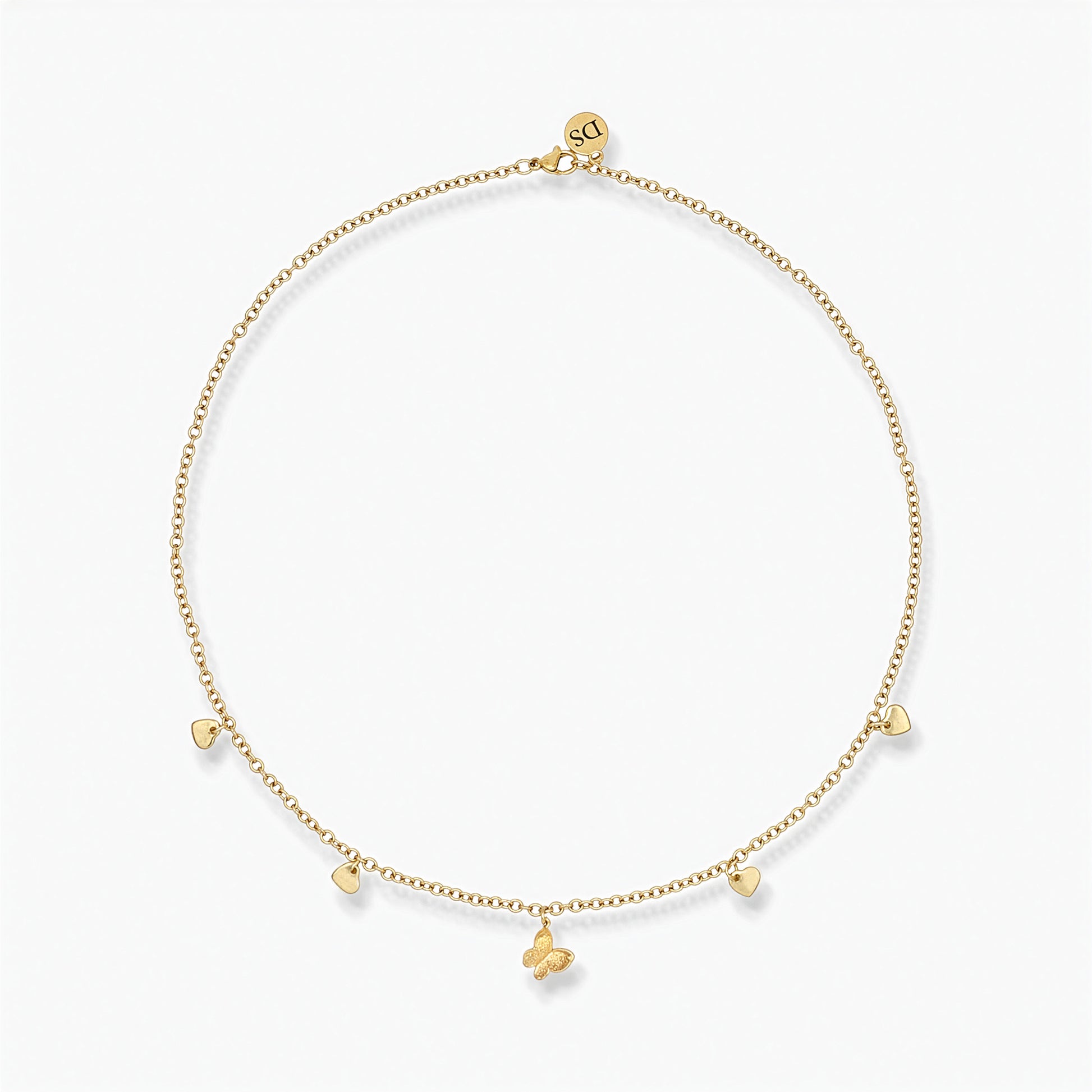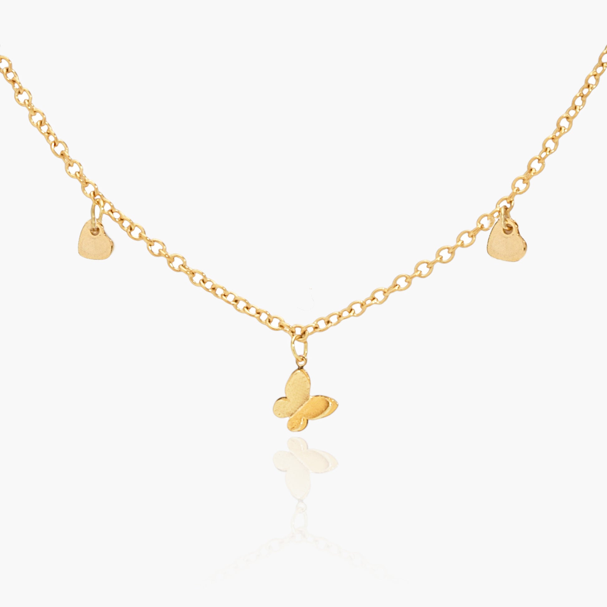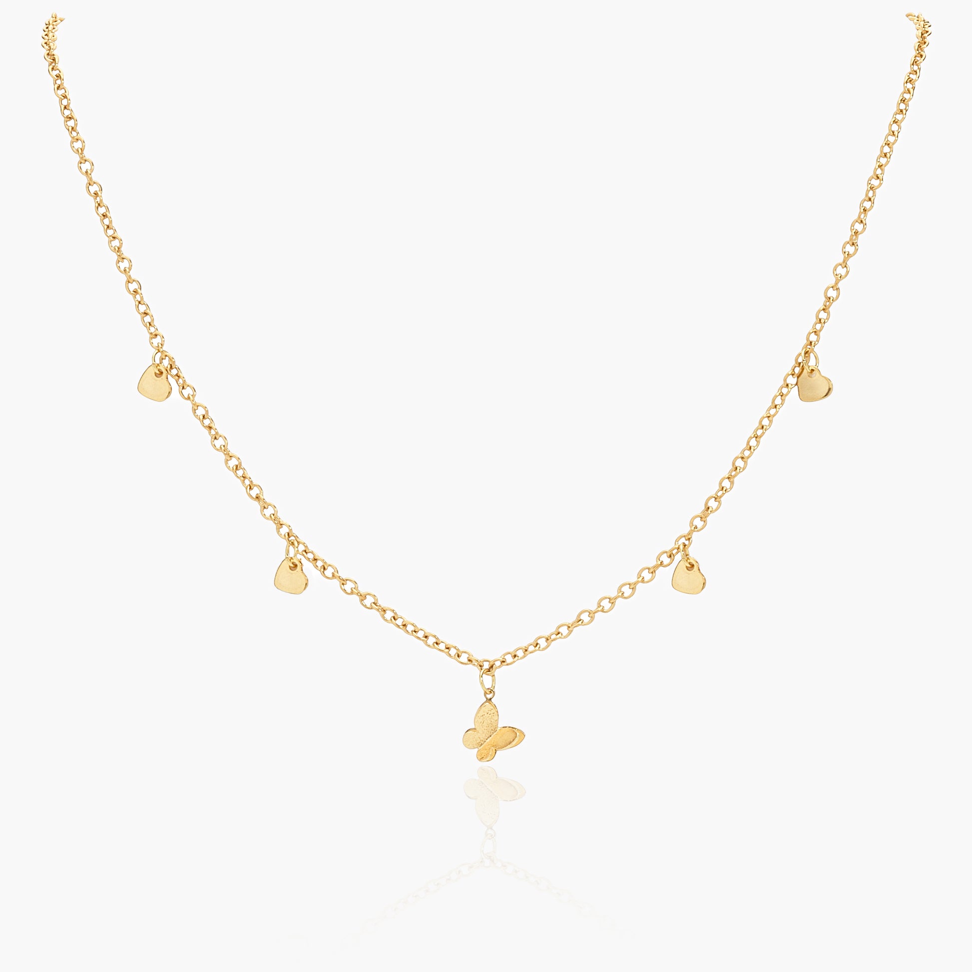 Collana Placcata Oro 18K con Pendente Farfalla e Charms Cuori